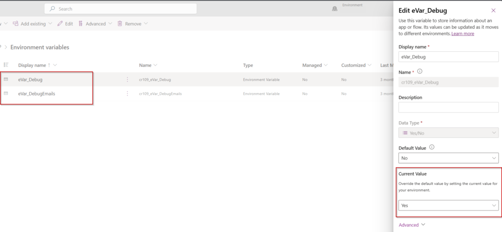 Imagesabove shows how these variables look in Power Apps.eVar_Debugcontrols whether emails are sent to test (eVar_DebugEmails) or real recipients.